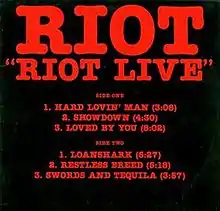 Riot Live is the first official extended play live recording by New York City heavy metal band Riot. Released in 1982, it followed on the heels of Restless Breed, the group's first studio album with vocalist Rhett Forrester. It was issued with different cover artwork in Europe.[2]