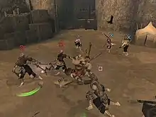 While the DualShock 2's left analog stick is used to maneuver the character, a sweep of the right analog stick will cause a beam of light to extend from the player's character. When this beam of light comes into contact with an enemy, an attack icon will be assigned to them. Attack icons are symbols that appear over the enemy's head and correspond with the X, square, and circle buttons on the controller. When an attack icon is assigned, the player can press the corresponding button to initiate a focused attack.[1]