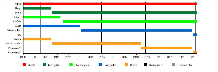 In December 2022 , the band announced that a new single would be released in January 2023. They also announced a new line-up, with a photo showing Vithia, Eva-B, the new bassist with his back turned, Air One, and a different, masked Phantom. This hinted at the departures of Fabulous Fab and Phantom (Thomas Pain). They have introduced their new drummer whose identity has yet to be revealed and new bassist, Yoru.[18]