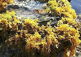 The consistency of the seaweed is rubbery, yellow more or less orange or reddish, varies with lighting and moistening. It turns brown when it is long outside the water and returns to its normal initial state when wet.