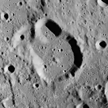 Ritchey is a small lunar impact crater named after the American astronomer George Willis Ritchey.[1] The crater is situated to the east of Albategnius in the central lunar highlands. Its somewhat angular rim is broken along the northwestern wall by a pair of smaller, adjacent craters. The floor of Ritchey is fairly flat, with a pair of small central mounds.