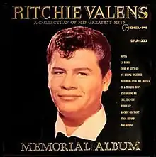Ritchie Valens Memorial Album is the first greatest hits compilation by Ritchie Valens, featuring his first three charted hits plus tracks from the previous three albums, released three years following his death in a plane crash. The original album was issued with a black album cover and the same photo of Valens from his second album Ritchie. A few months later, the album was retitled Ritchie Valens, His Greatest Hits and repackaged with a white album cover and a photo of Ritchie taken from his Del-Fi EP Ritchie Valens Sings (DFEP-1111). Both issues include the same back cover and album contents.