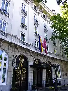 The chosen site was once an area occupied by barracks belonging to the Hippodrome Circus and the gardens of the old Theatre Tivoli, and was formerly owned by Jardines del Buen Retiro de Madrid.[5] The hotel's grand opening on 2 October 1910 was officiated by King Alfonso XIII in the company of ministers and representatives of the mayor of Madrid.[6] The hotel quickly became one of the leaders of the social and cultural life of the capital. The first board was chaired by Luis de Cuadra y Raúl Marquis de Guadalmina. The first hotel manager was Antonio Mella, who had previously managed the Ritz Hotel in Paris and London. His wife helped him in hotel management taking over guest services and laundry rooms.