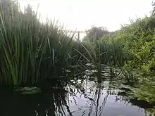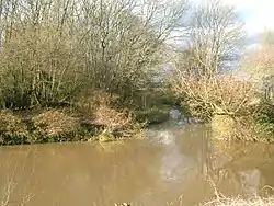 Several springs feed into the headwaters of the River Bourne and there are three contenders for its actual main source. It could be a spring on the North Downs at New House Farm, Yaldham, though the Environment Agency prefers a spring to the west of Oldbury Hill. It could be a spring on Oldbury Hill which feeds the Waterflash, a tree-ringed pond, which drains to the north of the hill. Oldbury Hill is on the Greensand Ridge. These merge in Ightham where the Bourne has cut a 117 feet (36 m) deep gorge through the limestone. In 1891 ice age relicts were found near here in a quarry. The river passes through woods to Basted, where a mill pond gives clues to its industrial past. From Ightham through Hadlow to Golden Green, the river powered numerous watermills. Road names are full of mill references. The principal products were flour and paper. The area of the Medway Valley near East Peckham is prone to flooding and the River Bourne contributes much water, so is regularly monitored and dredged to ensure an uninterrupted water flow. There is a gauging station at Hadlow (TQ 632 497 51°13′23″N 0°20′17″E).[2][3][4][5]