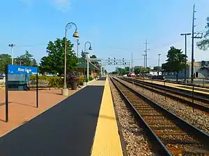 River Grove is a station on Metra's North Central Service and Milwaukee District West Line in River Grove, Illinois. The station is 11.4 miles (18.3 km) away from Chicago Union Station, the southern terminus of the lines.[2] In Metra's zone-based fare system, River Grove is in zone C. As of 2018, River Grove is the 138th busiest of Metra's 236 non-downtown stations, with an average of 333 weekday boardings.[1]