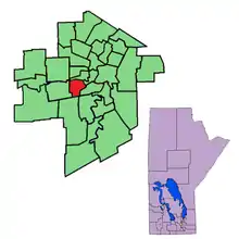 River Heights is a provincial electoral division in the Canadian province of Manitoba. It was created by redistribution in 1957, and formally came into existence in the 1958 provincial election. The riding is located in the south-central region of the City of Winnipeg.