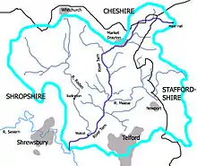 ![]() Map showing the River Meese, the other tributaries of the River Tern, and its drainage basin | |