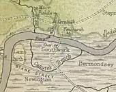 The watercourse drained first the seasonally wet (and occasionally flooded) ground at St George's Fields, now Geraldine Mary Harmsworth Park, in western Southwark.[1] Its course was east as follows: it took the line of Brook Drive then passed by the Elephant and Castle,[2] then passed the site of Lock Hospital, Kent Street.[3] This upper section was also known before that hospital's closure in the early 19th century as the Lock Stream.[3] It then passed the grounds of (since demolished) Bermondsey Abbey to the south, forming the channel north of what was the large Thames island of Bermond's ey (island).[4] The channel is today resembled by Abbey Street.[2] In the first millennium the river merged into the Thames by hooking north at three points. At least three tidally broadly flooded mouths existed, two of which were west of the former small island of Horsleydown and the third at the approximate site of St Saviour's Dock.[3][5] The Neckinger's northern mouth (now a surface water point of discharge into a deep, excavated inlet) divides the much-built up former marshland at the east end of Horsleydown island, known as Shad Thames and the low part of Bermondsey historically known as Jacob's Island to the east, which has also been built-up.