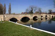 From Northampton, the river flows along a broad valley, formed by the enormous amount of water released by the melting ice during the Ice Age,[13] towards the east coast. The Nene now meanders through this wide, flat valley with flood plains, lakes, pools and mature gravel pits on either bank, a byproduct of the large glacial deposits in the valley. At Great Billing is Billing Aquadrome, a popular caravan and camping park with leisure facilities and a funfair, which is based around the river and various mature gravel pits.[14] The park is popular with fishermen and water skiers alike. The river's landscape is now dominated by mature gravel pit lakes. Some gravel extraction still takes place along the valley's basin. At Cogenhoe (pronounced /ˈkʊknoʊ/ locally[15]) the river passes through a watermill. The mill is a red-brick building built in the late nineteenth century, with a slate roof, from which all the machinery has been removed. Adjacent is a Mill House, built of coursed limestone rubble, and dated 1725.[16] At Earls Barton the river again passes an area of mature gravel pit lakes, and lock gates numbers 9 and 10. Further on, the river passes through Doddington Lock No 11 and the nearby Hardwater Watermill. This watermill, mentioned in the Domesday Book, ground wheat into flour for almost 1000 years. Thomas Becket, Archbishop of Canterbury, used the mill as a hiding place after escaping from Northampton Castle in 1164 and fleeing down the Nene to be sheltered by the miller before fleeing to France. The watermill ceased grinding flour after the Second World War. The present buildings date from the late eighteenth and early nineteenth centuries, and have been converted into dwellings.[17]