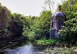 The Rye then descends into the heart of Leixlip. Here the river was harnessed by mills. In 1758, the site was used as a linen printing mill.[6] Later the Rye Vale distillery was built, producing more than 20,000 gallons of whiskey annually in 1837.[7] The distillery finally closed for good in the 1890s[8] and the distillery has since been converted into apartments.[9] The Rye then flows under the Rye Bridge to the confluence with the Liffey near the existing Boat House of Leixlip demesne.[10]