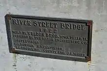 The River Street Bridge over the Iowa River at Iowa Falls, Iowa is an open spandrel bridge built during 1922–1924. It was built by the Weldon Brothers at cost of $16,900, including removal of the previous bridge on the site. It is the fourth bridge constructed on the site, a "pivotal" location in Iowa Falls' development. It has a long span, 140 feet (43 m), and is built with three side-by-side arched ribs supporting concrete pillars.[2]
