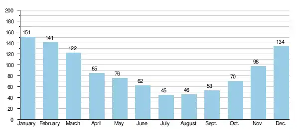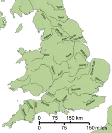 Rainfall in the catchment generally follows topography[48] with the highest annual rainfall of 1,450 mm (57 in) and above occurring over the high moorland uplands of the Derwent headwaters to the north and west, with the lowest of 580 mm (23 in), in the lowland areas to the north and east.[49] Rainfall totals in the Tame are not as high as would be expected from the moderate relief, due to the rain shadow effect of the Welsh mountains to the west, reducing amounts to an average of 691 mm (27.2 in) for the tributary basin.[48][50] The average for the whole Trent catchment is 720 mm (28 in) which is significantly lower than the average for United Kingdom at 1,101 mm (43.3 in) and lower than that for England at 828 mm (32.6 in).[51][52][53]