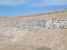 Gabions are stacked, rectangular wire boxes filled with stones. They are useful on steep slopes when the water is too fast for the use of a riprap technique. They are expensive and labor-intensive, as well as require periodical inspection for damage and subsequent maintenance, though they have been seen to demonstrate positive performance.[13]