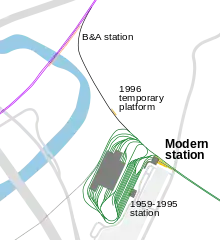 A track connection still exists with the main line; catenary is installed up to the junction for offloading trolleys delivered by the railroad onto the light rail network. On October 20, 1996, severe flooding overflowed the banks of the Muddy River and flooded the Green Line subway from the western portals to Boylston. From October 23 to 25, a commuter rail shuttle was run from a temporary platform at Riverside to South Station using the old track connection.[3]