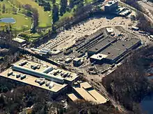 The MBTA began planning for transit-oriented development at Riverside by the 1980s.[8] In October 1997, Riverside was identified as a possible site for a parking garage, but this was not pursued.[9] On February 12, 2009, the MBTA authorized an 85-year lease of a portion of the Riverside parking lots for a mixed-use development. As originally planned, this development was to contain 420,000 sq ft (39,000 m2) of office space, 60,000 sq ft (5,600 m2) of retail space, and 190 residential units.[10] In late 2019, the city rezoned the site to allow for a larger development.[11] As of 2020, plans call for 254,000 sq ft (23,600 m2) of office space, 39,000 sq ft (3,600 m2) of retail space, 582 residential units, a 150-room hotel, and a 1,990-space parking garage. The station will be modified with two elevators, new ramps, and a new canopy structure. A parcel at the southwest end of the yard, originally to be used for the development, will be retained by the MBTA for yard expansion beginning around 2024.[11]