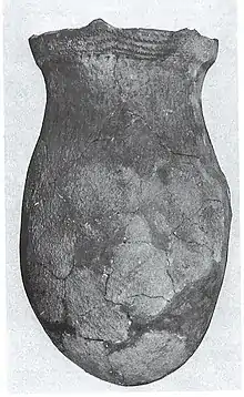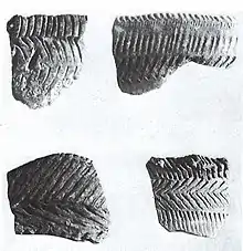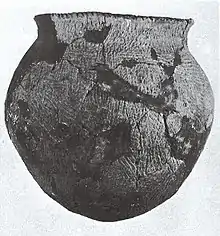 53 vessels of Wayne ward were recovered. Wayne ward is characterized by globular to slightly elongated vessels with constricted neck and outflared rims; grit-tempered with fine to medium grains; rims are plain and rarely decorated; and almost never castellated or collared. Surface finish is generally cordmarked. This type is similar to the "generalized woodland" or generic grit-tempered cordmarked vessels typical of the transition from Middle Woodland to Late Woodland.[1][6]