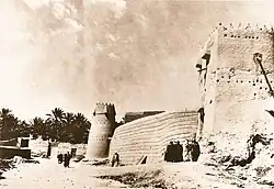 Historical accounts largely credit Riyadh's 18th century ruler Daham bin Dawas al-Shalaan for being the first one to erect a wall around Riyadh in around 1704.[4] After expelling the Ottoman-backed Egyptian forces from Najd and reinstating the Second Saudi State in 1824, Imam Turki al-Saud ordered the reconstruction of Daham's walls.[5] However, after the victory of the Rashidi dynasty in the Battle of Mulayda against the House of Saud in 1891, the new ruler of Najd Ibn Rashid went on to desecrate and destroy much of al-Saud's structures, including the Riyadh wall.[6] After Ibn Saud deposed the Rashidis in 1902 after the Battle of Riyadh, he ordered the rehabilitation of the wall in order to safeguard the city from trespassers and invaders and was demolished nearly four decades later in 1950 when Riyadh underwent modernization and expansion.[2]