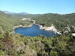 The reservoir holds 1,000,000 cubic metres (35,000,000 cu ft) of water.[2] It feeds a power plant 7 kilometres (4.3 mi) downstream.[5] A tunnel carries water from the dam to the hydroelectric power station at Sainte Lucie de Tallano in the Levo plain.[3] The power is delivered during daily peak periods of electricity consumption. With installed capacity of 55 MW the power plant delivers almost 40% of the island's hydroelectricity. Annual output is estimated at 80GWh.[3]