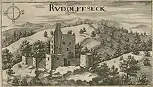 The ruins of Rožek (Rudolfseck) Castle, first mentioned in written documents in 1247,[1] can still be seen near the settlement. It was damaged in the peasant revolt of 1515.[5] The castle owners, the Gall family, became fervent Protestants and a number of prominent Protestant figures were buried in the castle chapel. When the castle started to deteriorate in the 17th century, the castle dwellers relocated to other castles in Moravče and Češnjice pri Moravčah.[1]