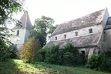 The church was built around 1225, and was first mentioned in a document from 1327.[1] A Romanesque basilica dates to the 13th century; surviving elements include the choir, triumphal arch, pillars between the main and side naves, and parts of the north portal, including the windows and upper level. Fortification work took place in the 16th century, with most of the windows and the entrance room in the western part daring to the 18th. In the 19th century, the nave was given a vaulted ceiling held up by pilasters with capitals. The paintings above the triumphal arch are in the Biedermeier style. The 1682 Baroque altar, with its six Corinthian columns and baldachin, is particularly decorative, as is the baldachin-covered pulpit of 1781.[2]