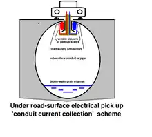 - Where an external electric supply is provided, this is typically with overhead conductors or above-ground rails or (rarely) sub-surface electro-magnets.