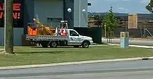 Typically, a worksite will be set up with warning signage well in advance of the actual work area. This may involve (in Australia) "Roadworks Ahead", temporary speed restrictions, "Worker Symbolic" (a stylized workman with a pile of rubble, black silhouette on a retroflective orange background), "Reduce Speed", "Lane Status" boards (indicating that some lanes on a multilane roadway will be closed), "Prepare to Stop" and advisory signs telling what is happening (e.g. Water Over Road, Trucks Entering, and Power Line Works Ahead). If lanes have been closed, large flashing arrows (Arrow Boards) on trailers or specialized vehicles may be utilized to give motorists warning to move over. Motorists will be advised they are leaving a worksite by speed reinstatement and a "End Roadworks" signs.