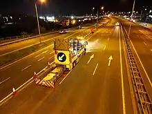 Sometimes on dual carriageways, it is necessary to divert one carriageway onto the opposing carriageway, forming a "contraflow". This cannot be done "on the fly", as high-speed (100+km/h), high-volume (500 - 1000+ vehicles per hour) traffic is involved, generating a huge risk to workers. In this case advisory signs will be erected weeks or even months in advance, and new lanes defined by bollards anchored firmly to the road-base will be installed, usually at night when traffic is expected to be minimal. Programmable Variable Message Signs may be utilized at strategic locations to inform motorists.