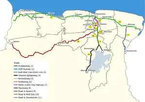 A major road is the 2-lane East-West Link connecting Albina to Nieuw Nickerie. The road was fully paved on 17 December 2009.[7] There is a Southern East-West Link connecting Paramaribo with Apoera via Bitagron, however it is mainly unpaved.[8]