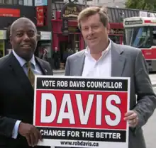 Rob Davis is a Canadian politician. He served on the City of York council from 1991 to 1997. He was the first Black city councillor in the 200-year history of the City of York. He was elected as a member of the amalgamated Toronto City Council from 1997 to 2000. He was also the first Black city councillor of the amalgamated Toronto City Council. In 2023, he announced his intention to run for mayor of Toronto in a by-election called as a result of the resignation of Mayor John Tory. Davis told the media that Torontonians no longer felt safe on the TTC, were struggling with the high cost of housing, and thought the council was wasting taxpayer's money on changing the name Dundas instead of helping the homeless and people who are less fortunate. Davis vowed to make Toronto safer, cleaner, and kinder.[1]