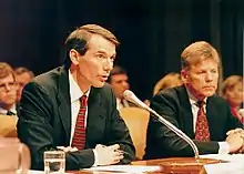 Portman has said that his proudest moments as a U.S. Representative were "when we passed the balanced budget agreement and the welfare reform bill."[23] As a congressman, Portman traveled to Argentina, Chile, Costa Rica, the Czech Republic, Egypt, Iraq, Israel, Jordan, Kuwait and Mexico.[18] During his time in the House, Portman began assisting prominent Republican candidates prepare for debates by standing in for their opponents in practice debates. He took the role of Lamar Alexander (for Bob Dole in 1996), Al Gore (for George W. Bush in 2000), Hillary Clinton (for Rick Lazio in 2000), Joe Lieberman (for Dick Cheney in 2000), John Edwards (for Cheney in 2004), and Barack Obama (for John McCain in 2008 and Mitt Romney in 2012).[29][30] His portrayals mimic not only the person's point of view but also their mannerisms, noting for instance that he listened to Obama's audiobook reading to study his pattern of speech.[31]