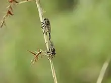 After hatching, robber fly larvae generally seem to live in soil, rotting wood, leaf mold, and similar materials, some being predatory and others detrivorous.[5] Larvae are also predacious, feeding on eggs, larvae, or other soft-bodied insects. Robber flies overwinter as larvae and pupate in the soil. Pupae migrate to the soil surface and emerge as adults, often leaving behind their pupal casing. Complete development ranges from one to three years, depending on species and environmental conditions.[6]