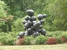 Chambers' 2004 sculpture "Sugabus", 45 globes of bronze representing the elements of a sucrose molecule in the shape of a poodle, appears at Laumeier Sculpture Park in St. Louis, Missouri. The work's title is a portmanteau of "sugar" and Cerberus, the three-headed dog that guards the underworld in ancient Greek mythology.[1] The sculpture is 14 ft × 12 ft × 12 ft (4.3 m × 3.7 m × 3.7 m) and weights 6 short tons (5.4 t).[7]