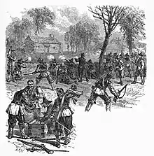 In 1641, Coles and John Greene gave Samuel Gorton—a religious leader and agitator fleeing Portsmouth—some of their land in Pawtuxet.[57][58] The parcel Coles gave to Gorton was at Papaquinapaug, the region near present-day Fenner Pond south of Roger Williams Park.[59][60] To Coles's dismay, Gorton and his followers, the Gortonites, rejected the authority of the Plantation Agreement of 1640 and became embroiled in bitter disputes.[61] The trouble began when the Providence arbitrators voted to settle a dispute by seizing some cattle owned by a Gortonite named Francis Weston. The Gortonites fought off the townsmen sent to take the cattle.[62] Seeking a way to expel the Gortonites from Pawtuxet, Coles and three other original Pawtuxet settlers—William Arnold, William Carpenter, and Benedict Arnold—traveled to Boston in 1642 to petition the General Court to place their land under the jurisdiction of Massachusetts Bay Colony.[63] The General Court made Coles and the other three petitioners justices of the peace.[64] The Gortonites moved south to Shawomet, out of the jurisdiction of the justices and Massachusetts Bay, where they purchased 90 square miles from the sachem Miantonomi.[65] Benedict Arnold convinced Socononoco and Pomham, the sachems of Pawtuxet and Shawomet, to complain to Massachusetts Bay that they did not agree to the sale.[66] Gorton and some Gortonites were arrested in 1643 by Massachusetts Bay soldiers after a violent struggle and were taken to Boston to stand trial.[63][67]