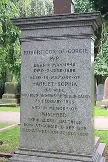 Robert J. Cox FRSE (6 May 1845 – 2 June 1899) was a Scottish gelatine and glue manufacturer and Liberal Unionist politician.