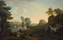 Crone remained in Rome until 1767. The next year he was in London, where he showed two drawings at the Society of Arts.[4] From 1772 until 1778 he exhibited annually at the Royal Academy.[3] Although much hindered by frequent epileptic fits, and he has also been described as small in stature and "deformed".[1] His first exhibited pictures were two landscapes called Morning and Evening.[3] The only work he exhibited in Dublin was with the Irish Society of Artists in 1770 with Landscape and Figures.[2] He exhibited drawings, some of which were finished after Richard Wilson's style in black and white chalk on a bluish-grey paper. His landscapes are now very scarce and much sought after; a few examples are in the Royal Collection.[3]