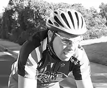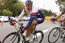 ![]() Rob Crowe riding in the TAC VicRoads 2003 road-safety ambassador cycling kit with 'hazard striping' | |