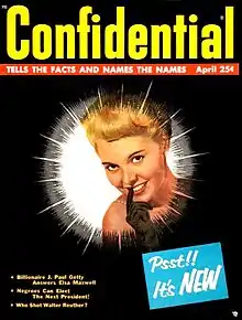 Back in 1947, Harrison "mocked up a 'fact' magazine called Eyewitness,"[22] which was never published. Then in 1952, Harrison spent six months reworking the format of a new, similar magazine. He would later say: "I must have ripped that thing apart three times before I published it, and it still wasn't right."[26] Supposedly inspired by Virginia Hill's testimony to the Kefauver Committee hearings,[27] Harrison launched his tabloid-style gossip magazine: Confidential. As with the earlier New York Graphic, it concentrated on exposing the substance abuse habits, criminal records and hidden political and sexual preferences of celebrities. For example, the magazine alleged that June Allyson had extramarital affairs ("How Long Can Dick Powell Take It?"),[28] that Johnnie Ray was a "drag queen" ("Is It True What They Say About Johnnie Ray?")[29] and that Robert Mitchum was an exhibitionist ("Robert Mitchum...the Nude Who came to Dinner!")[30] Apart from spreading gossip, Confidential combined the exposés with a conservative agenda especially targeted at those who sympathized with the left wing and in identifying those engaged in "miscegenation."