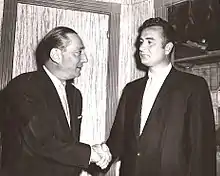 In September 1956, Harrison generated front-page headlines around the world when he allegedly was shot in the shoulder during a safari in the Dominican Republic by Richard Weldy, a travel agency owner and former executive for Pan American Grace Airways.[72] Weldy, variously described as a "jungle trapper and guide"[73] or "a big game hunter,"[74] purportedly harbored a grudge over a Confidential story about his ex-wife, Pilar Pallete, a Peruvian actress who was then married to John Wayne. The nonexistent Confidential article depicted Pallete as having an affair with Wayne while married to Weldy. According to newspaper accounts, Weldy fled the scene, leaving Harrison to die alone in the jungle with his blonde girlfriend; the two were eventually rescued by the Dominican Army. Weldy was later arrested by police. But Harrison refused to press charges against Weldy and the two publicly reconciled.[75] Later the whole story was revealed to be a hoax—the shooting never took place. Photos of a wounded Harrison in a hospital were staged. Even the "girlfriend" was an actress that Harrison hired for the publicity stunt.[76] During a television interview with Mike Wallace, Harrison fooled the CBS film crew into thinking that a birthmark on his back was the bullet wound.[59][77]