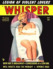 The one Harrison men's magazine that differed from the Beauty Parade format was Whisper, started in April 1946. It began as a clone of Beauty Parade, but became more explicit, violent and blatantly sexual. In 1953 Harrison was arrested for staging a Whisper photo shoot at a New Jersey golf course. It starred Page as a prisoner being tortured by models dressed in skimpy Ku Klux Klan-like costumes. But the old format of suggested nudity and sex was not working in the 1950s as it did in the '40s. During the heyday of his cheesecake magazines, Harrison moved with his sister Helen from their two-bedroom apartment into a nine-bedroom suite at the Parc Vendôme. Harrison became a fixture on the New York nightclub scene and was portrayed as a playboy in society columns. He indulged in his trademark proclivity toward all things white—Cadillacs, tailored suits from Sulka, cashmere polo coats and hats.[20][21] He was often photographed in the company of Broadway or Hollywood starlets. But the circulation of his magazines declined in the post-war years. By early 1952[22] his accountant told him that he was broke.[23] In addition to rival imitators, Harrison "could not compete with the new celebrity focused men's magazine, Playboy, whose first issue, released in 1953, featured a full color centerfold of Marilyn Monroe."[24] But Harrison had an aversion to real nudity and never went the route of Playboy. Instead, he returned to his New York Graphic roots. Thus Whisper would morph a third time in the 1950s to imitate the most audacious of Harrison's periodicals.[25]