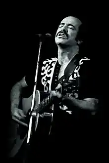 Hunter's participation in the Grateful Dead was dominated by his collaboration with Garcia, based on, according to McNally, "friendship, common experience, Hunter's extraordinary capacity for empathy, and his sterling ability to translate that into lyrics."[5] He also worked with other band members; in particular, on American Beauty he worked with McKernan on "Operator", Lesh on "Box of Rain", and Weir on "Sugar Magnolia". However, he eventually decided he could only work with Garcia, and the duo wrote numerous songs together over the next 25 years.[5] Their relationship was often challenged by Garcia's difficulties with drug addiction; in 2015, Hunter said he was unhappy with the extent of cocaine use among band members.[5] Hunter was described as a "proudly irascible" presence in the band, who would often veto attempts to use the band's songs for commercial purposes.[1][2] After Garcia's death from a heart attack at a heroin rehabilitation clinic in 1995, the Grateful Dead disbanded.[17]