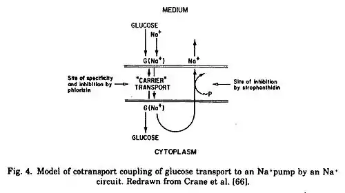 - Ernest M. Wright and Eric Turk. "The sodium glucose cotransport family SLC5". Pflügers Arch 447, 2004, p. 510. "Crane in 1961 was the first to formulate the cotransport concept to explain active transport [7]. Specifically, he proposed that the accumulation of glucose in the intestinal epithelium across the brush border membrane was coupled to downhill Na+ transport cross the brush border. This hypothesis was rapidly tested, refined and extended [to] encompass the active transport of a diverse range of molecules and ions into virtually every cell type.”