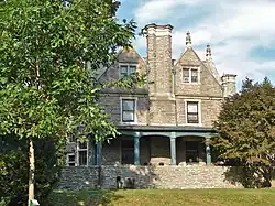 The Robert M. Hogue House is a historic mansion located in the Mount Airy neighborhood of Philadelphia, Pennsylvania. It was built in 1896, and is a 2+1⁄2-story, rectangular stone dwelling in the Jacobean revival-style. It features two-story projecting bays with leaded glass windows, soaring cross gables and dormers, and pointed arch openings. Also on the property is a contributing stable / carriage house and a free standing stone fireplace. It housed the Philadelphia School of Criminology from the late-1940s to 1963, then housed Combs School of Music until 1983.[2]