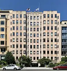 Scholz still designed buildings on his own during his partnership with Baer, including houses and smaller projects like gas stations and restaurants.[11][15][16] The duo's last major project together demonstrated a change in architectural style that Scholz would repeat throughout the next decade and earn him the distinction of being one of the city's most prominent Art Deco architects.[2][5] Similar to Alban Towers, The Keystone was a large apartment building constructed on a prominent corner, 22nd Street and Pennsylvania Avenue NW in Foggy Bottom. Constructed in 1931, Scholz incorporated new building materials into The Keystone, including aluminum panels, a key design feature of the Art Deco style.[2][17] During their 12-year partnership from 1922 to 1934, Scholz and Baer designed and constructed 122 buildings.[2]