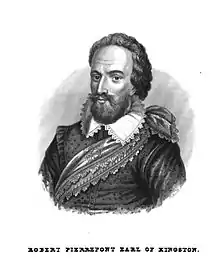 Robert Pierrepont, 1st Earl of Kingston-upon-Hull (6 August 1584 – 25 July 1643) was an English nobleman who joined the Royalist side in the English Civil War after some delay and became lieutenant-general of the counties of Lincoln, Rutland, Huntingdon, Cambridge and Norfolk. He was killed in a friendly fire incident after being captured by Parliamentary forces.