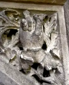 In about 1520,[16] at the end of his life, he built a fine chantry chapel as an addition to the Gaunt's Chapel in Bristol (today known as St Mark's Church, Bristol), to the east end of the south aisle, beyond the tower, known as the "Chapel of Jesus" or "Poyntz Chapel". It should be distinguished from the Poyntz manorial chapel in Iron Acton Church, the family's chapel as lords of the manor and patrons of the advowson. It is fan-vaulted, and has two niches of unknown use on the North wall.[17] The floor is covered with coloured Spanish tiles, probably from Seville and contemporaneous with the building.[18] The center boss of the vaulted ceiling comprises a shield displaying the arms of Poyntz impaling Woodville, representing his marriage. At the entrance to the chapel is sculpted in stone the canting crest of Poyntz, A hand clenched,[19] from the French poigne, "fist".[20]