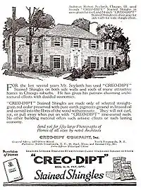 During his career, Seyfarth's work appeared in magazines and journals and in the advertisements of various architectural supply firms. The extent to which this was done is not entirely known, but articles by Eleanor Jewett (1892–1968), art critic for the Chicago Tribune ("Cape Cod Architecture seen in B.L.T.'s Home" discussing the Taylor house at 92 Dell Place in Glencoe, Illinois) and Herbert Croly of the Architectural Record ("The Local Feeling in Western Country Houses", October, 1914, which discusses the Kozminski and McBride houses in Highland Park at 521 Sheridan Road and 2130 Linden, respectively) survive to give us some idea of how Seyfarth's work was received during the time he was practicing. (Croly would later go on to become the founding editor of The New Republic magazine.[112]) Additionally, photographs of houses he designed appeared in The Western Architect magazine a number of times in the 1920s. Also surviving are copies of advertisements from the Arkansas Soft Pine Bureau (see image, right), the California Redwood Association (again with the McBride House), the Pacific Lumber Company (featuring the Churchill house in Highland Park at 1375 Sheridan Road), The Creo-Dipt Company (see image, left), the White Pine Bureau, the American Face Brick Association and the Stewart Iron Works Company of Cincinnati (with a picture of the H. C. Dickinson house at 7150 S. Yale in Chicago). In 1908, his Prairie-style house for Dickinson was published in House Beautiful magazine.[97] In 1918,[113] the Arkansas Soft Pine Bureau released a 32 page portfolio featuring houses built from Seyfarth's designs. Included were photographs, floor plans, bills of material, an estimate of the costs, and a brief description of important features. Entitled The Home You Longed For, the booklet was announced in Building Age Magazine under the heading "New Catalogs of Interest to the Trade".[114] Although generally unavailable today, it must have enjoyed a wide circulation in its time. It was acquired the following year for the collection of the Carnegie Library of Pittsburgh,[115] and referred to that same year in an illustrated article that appeared in Printers' Ink Monthly[116] entitled "The Loose-Leaf Portfolio - an Aid to Reader Interest", where it was described as "...a very attractive loose-leaf portfolio" and as a successful example of its type of publication.[117]