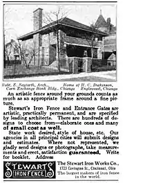 - 3.) H.C. Dickinson house. This is the first Robert Seyfarth house, writ large, in brick and stone. Although the sleeping porch on the second floor has been enclosed in a manner not in keeping with the style of the house, this house is otherwise also very similar in composition to the John Ellis [122] house in Beverly Hills, Chicago (1908), which shows that Seyfarth, like many of his profession, felt free to copy himself to develop, refine or expand upon an idea further for another client when necessary. Note that the house retains the wrought iron fence that appeared with it in the 1909 ad for the Stewart Iron Works Co. (see left).