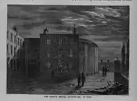 The painter Benjamin Robert Haydon was himself in the prison for debt at the time and later painted two canvases to mark the occasion, "Chairing the Member" and "The Mock Election".[7] Stanton appears in the second, "attired in the quilt of his bed, and in a yellow turban... pointing, without looking at his opponent, with a sneer".[8] Wearing a blue rosette on his turban, Stanton was one of three candidates, the others being the "Lord Mayor of King's Gate Prison", with a yellow and blue rosette, and an Irishman, Joseph Meredith, wearing a red rosette, who is being instructed in the art of boxing by Henry Hold, a well-known pugilist.[7]