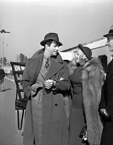 In February 1944, Taylor helped found the Motion Picture Alliance for the Preservation of American Ideals.[22] In October 1947, Taylor was called to testify before the House Committee on Un-American Activities regarding Communism in Hollywood.[23][24] He did this reluctantly, regarding the hearings as a "circus" and refusing to appear unless subpoenaed.[25] In his testimony concerning the Screen Actors Guild (SAG), delivered on October 22, 1947, Taylor stated: "It seems to me that at meetings, especially meetings of the general membership of the Guild, there was always a certain group of actors and actresses whose every action would indicate to me that, if they are not Communists, they are working awfully hard to be Communists."[26] Two people already under investigation by the FBI, Karen Morley and Howard Da Silva, were mentioned as troublemakers at SAG meetings. Taylor alleged that at meetings of the SAG, Da Silva "always had something to say at the wrong time." Da Silva was blacklisted on Broadway and New York radio,[27] and Morley never worked again after her name surfaced at the hearings.[28] Taylor went on to declare that he would refuse to work with anyone who was suspected of being a Communist: "I'm afraid it would have to be him or me because life is too short to be around people who annoy me as much as these fellow-travelers and Communists do".[29] Taylor also labeled screenwriter Lester Cole "reputedly a Communist", adding "I would not know personally".[30] After the hearings, Taylor's films were banned in Communist Hungary and in Czechoslovakia, and Communists called for a boycott of his films in France.[31]