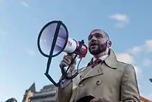 White speaking at a protest against President Donald Trump's proposed immigration bans in January 2017